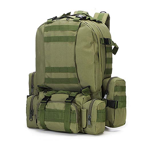 - 【Combination Detachable Backpack】The Molle tactical backpack about 19.6″*7.9″*11.8″, consists of main backpack (45L), one front detachable tactical waist pack (7L), and two side detachable accessories pouches (2L), this multipurpose backpack can be considered as a 45L or 55L hiking daypack according to your needs.