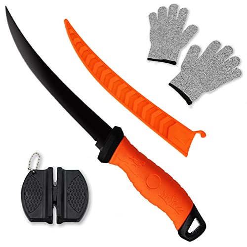 4. Fishing Fillet Knife, 7 Inches Professional Fillet Knife Set Stainless Steel Blade in Corrosion Resistant Coating, with Sharpener and Cutting Resistant Gloves, for Fishing and Outdoor, Orange
