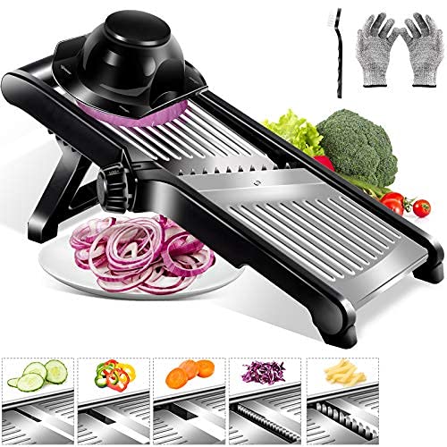 | 8 | Adjustable Mandoline Food Slicer, Kitchen Stainless Steel Food Cutter for Vegetable Fruit Cheese,Food Blade Onion Cutter with Spiralizer Vegetable Slicer and Cut Resistant Gloves | 9.64 | Check Price | |